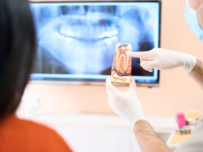 しみる(冷たいもの、熱いもの、甘いもの等)、痛いなどの症状は、小さい(浅い)むし歯の場合、無症状なことが多いのです。そのため、検診時むし歯があることを伝えても、「痛くない」、「しみない」とおっしゃる方がいらっしゃいます。症状が出る理由は歯の中央に位置する歯髄(歯の神経)近くまでむし歯が及ぶ為です。進行してむし歯が神経に達していると、神経を取る治療をします。